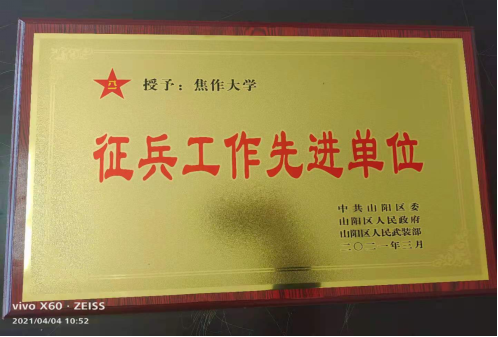 2020年,学校成立校院两级征兵工作领导小组,校武装部与各学院通力协作,运用线上辅助方式,创建征兵专用咨询微信群,通过政策宣讲进班级、进宿舍等形式,广泛开展征兵宣传发动。积极配合山阳区人民武装部做好体检、政审、役前训练、定兵、送兵、优抚等工作。